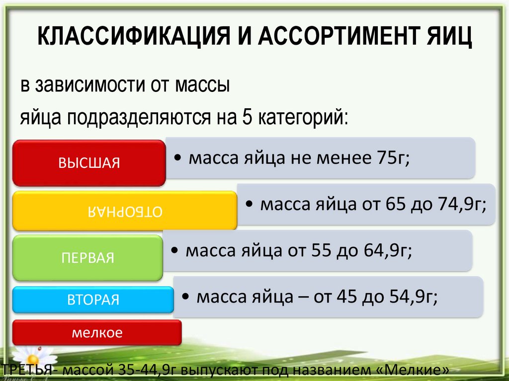 КЛАССИФИКАЦИЯ И АССОРТИМЕНТ ЯИЦв зависимости от массы