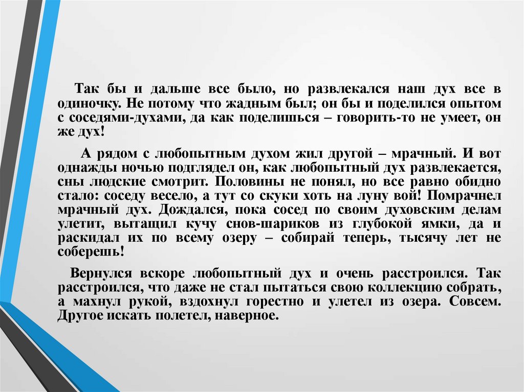снов спит, а дух облачко в шарик скатает и в озеро нырнет. Там,