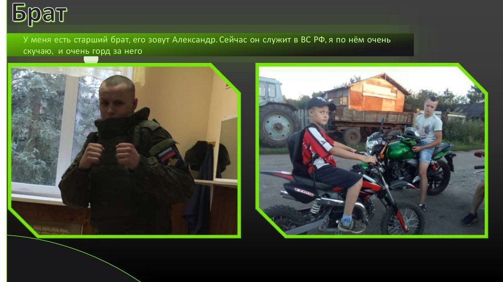 У меня есть старший брат, его зовут Александр. Сейчас он служит в ВС РФ, я по нём оченьскучаю, и очень горд за него