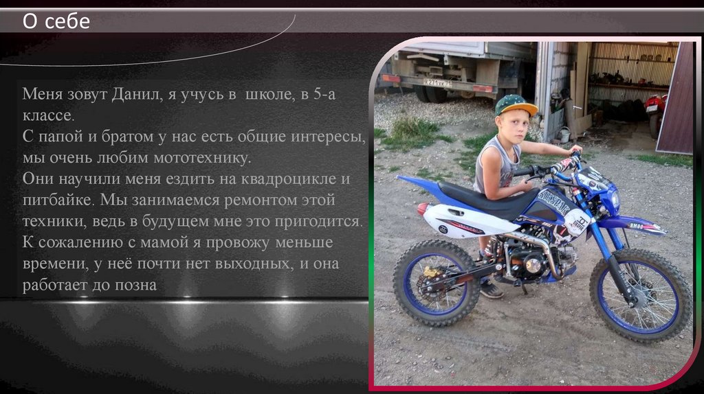 О себеМеня зовут Данил, я учусь в школе, в 5-а