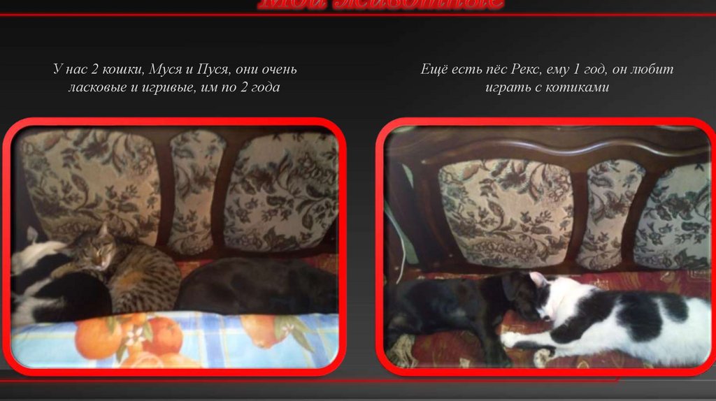 У нас 2 кошки, Муся и Пуся, они оченьласковые и игривые, им по 2 года