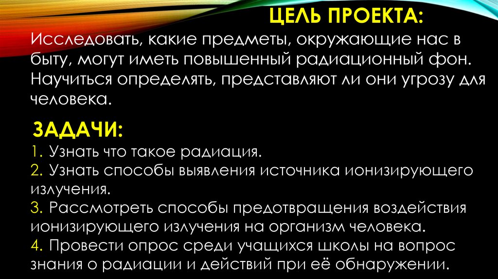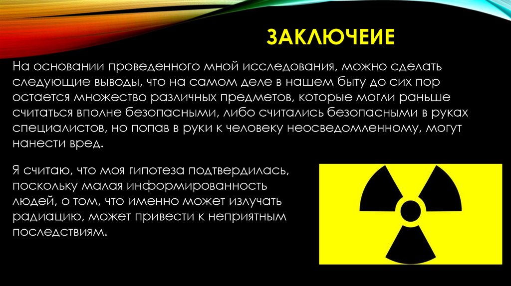 ОБЪЕКТ ИССЛЕДОВАНИЯ: радиацияПРЕДМЕТ ИССЛЕДОВАНИЯ: вещи и предметы