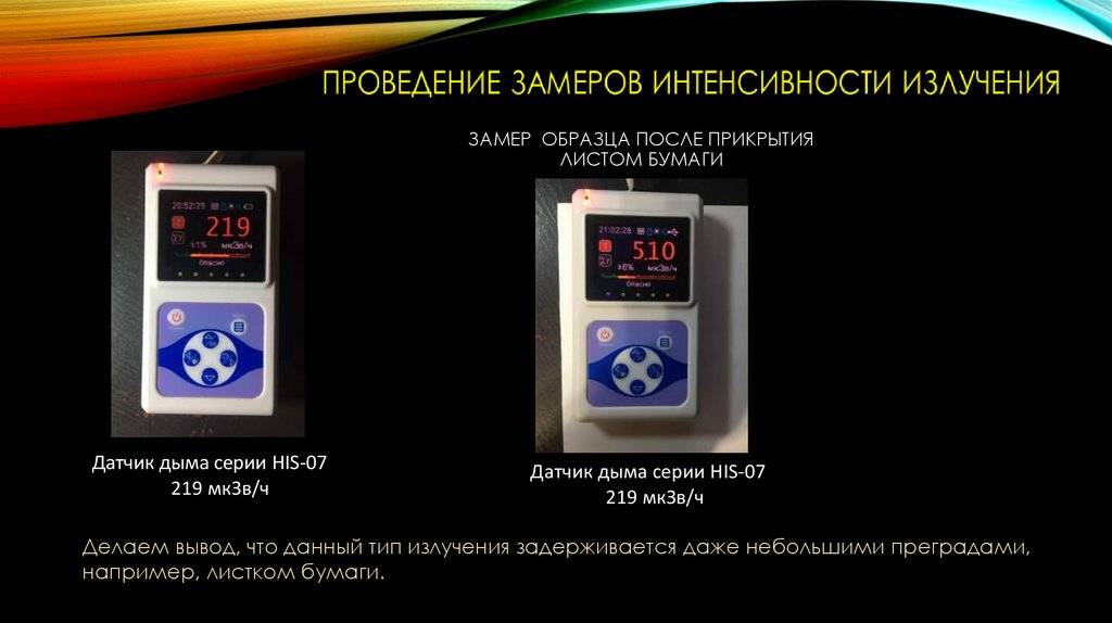 Делаем вывод, что данный тип излучения задерживается даже небольшими преградами,