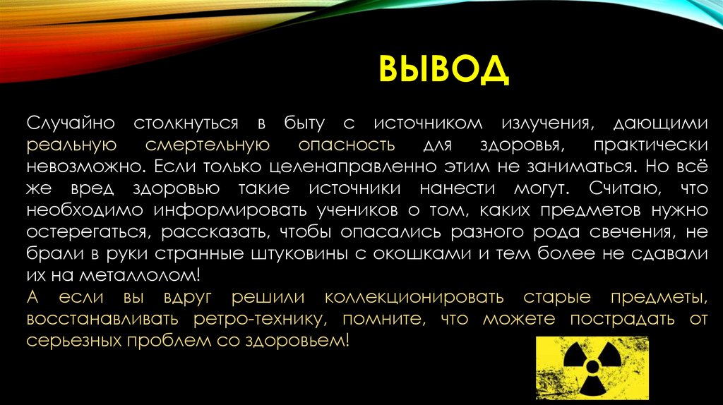 ВЫВОДСлучайно столкнуться в быту с источником излучения, дающими