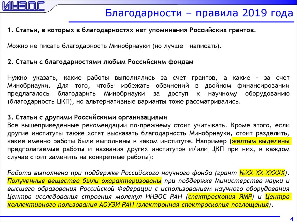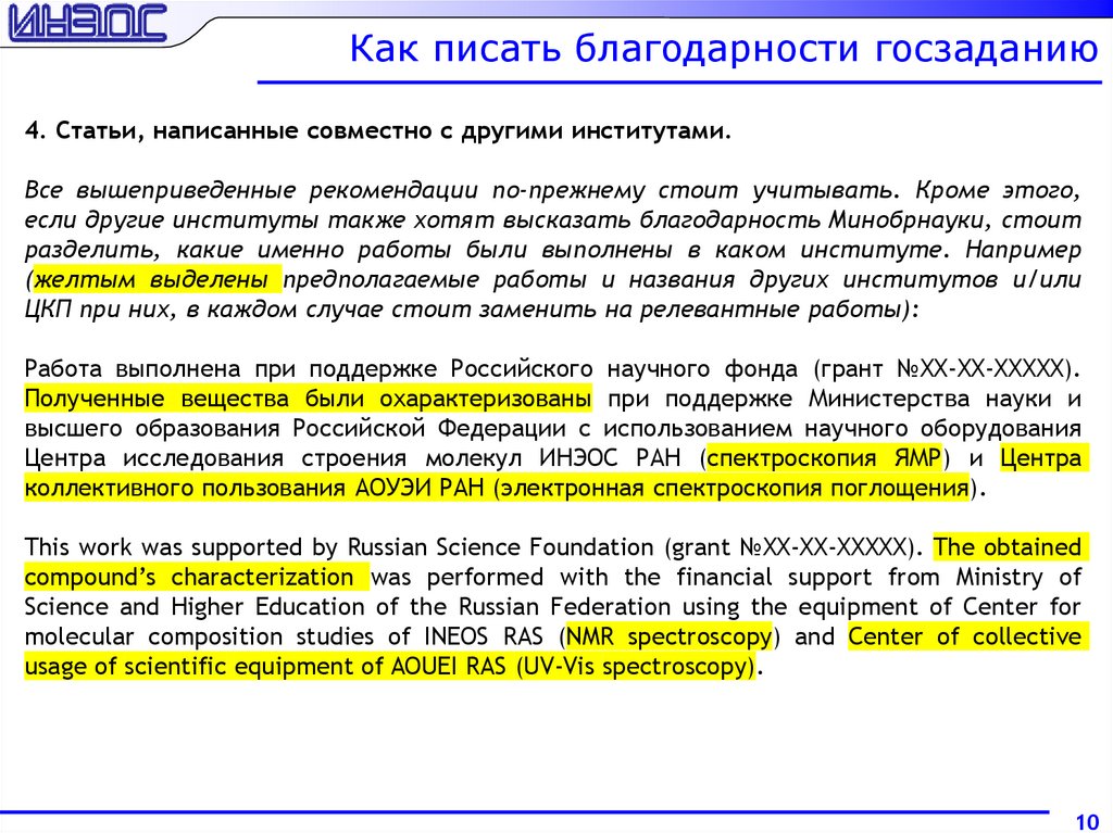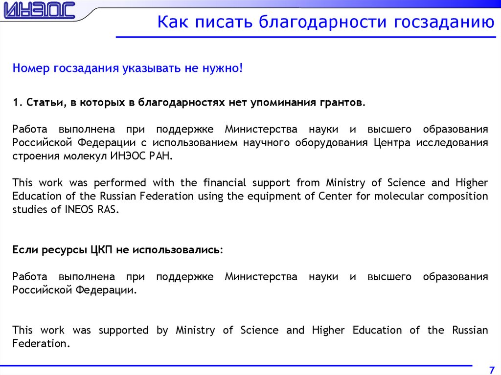 Как писать благодарности госзаданию4. Статьи, написанные совместно с другими институтами.