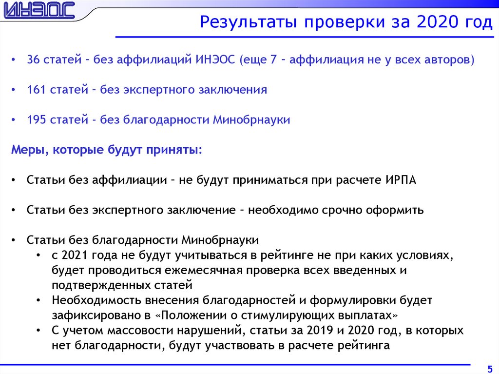 Результаты проверки за 2020 год• 36 статей – без аффилиаций ИНЭОС (еще 7 – аффилиация не у всех авторов)