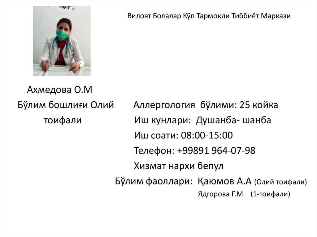 Вилоят болалар кўп тармоқли тиббиёт марказининг Аллергология Бўлими маркази