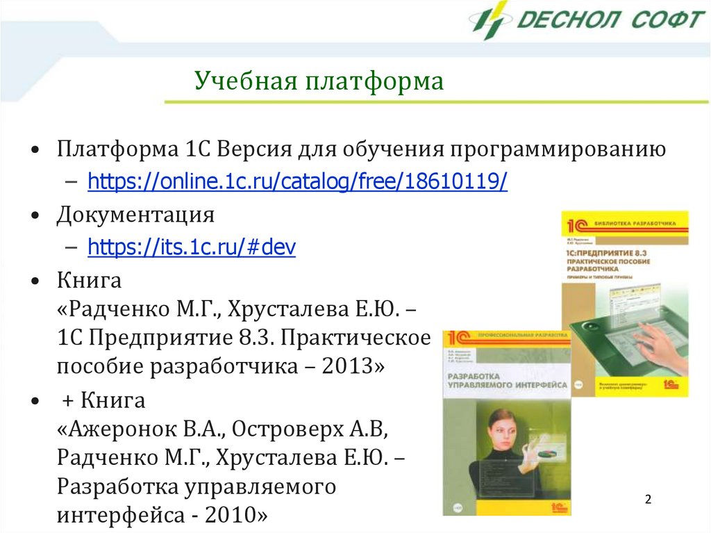 Учебная платформа• Платформа 1С Версия для обучения программированию