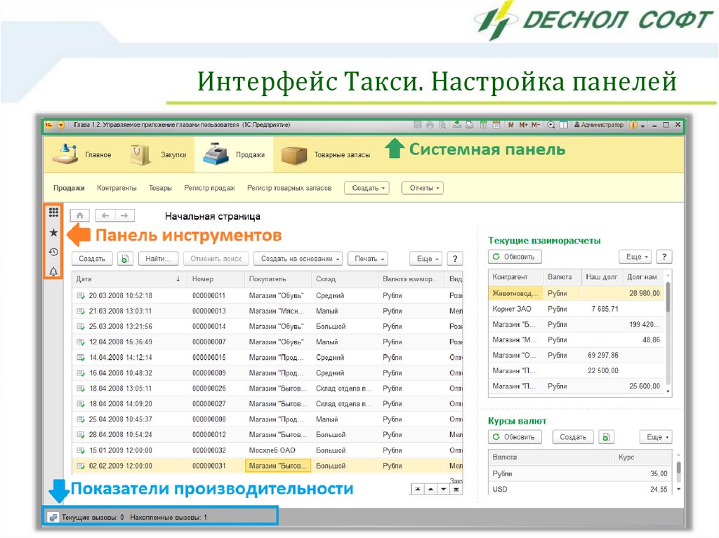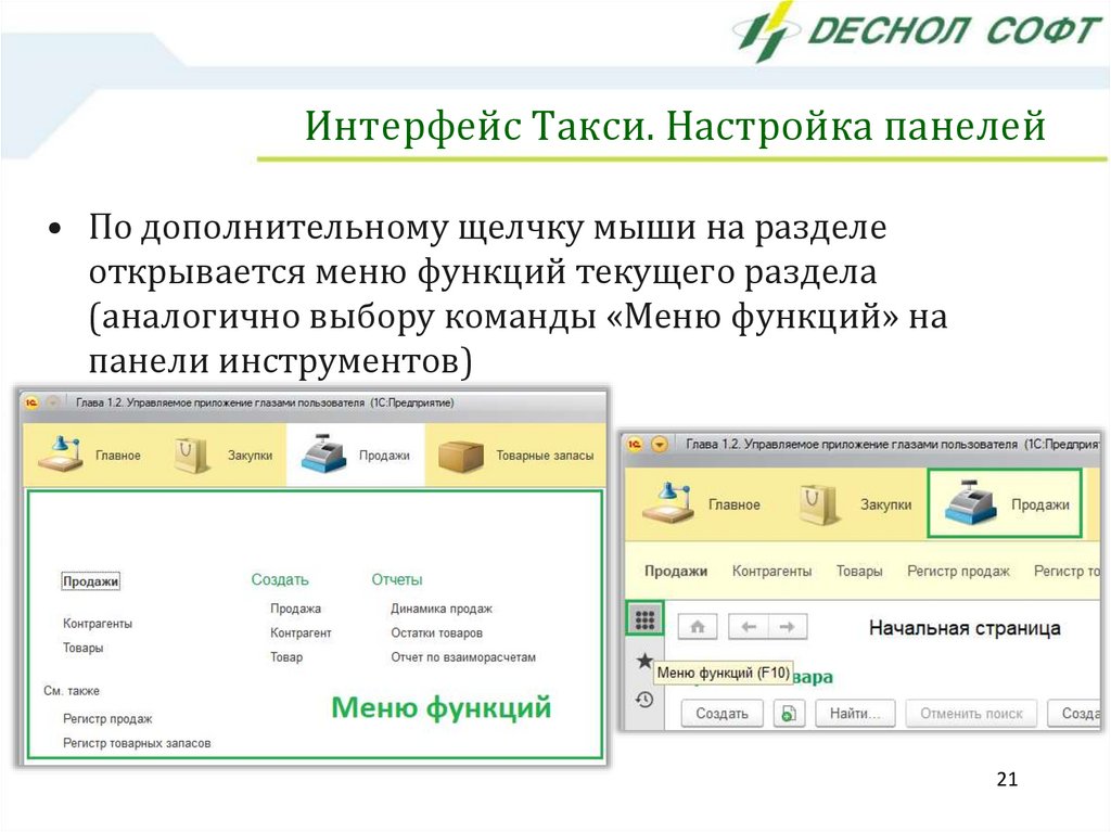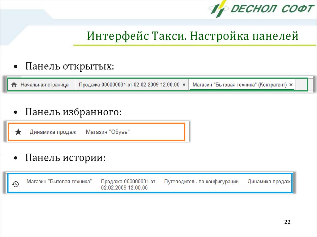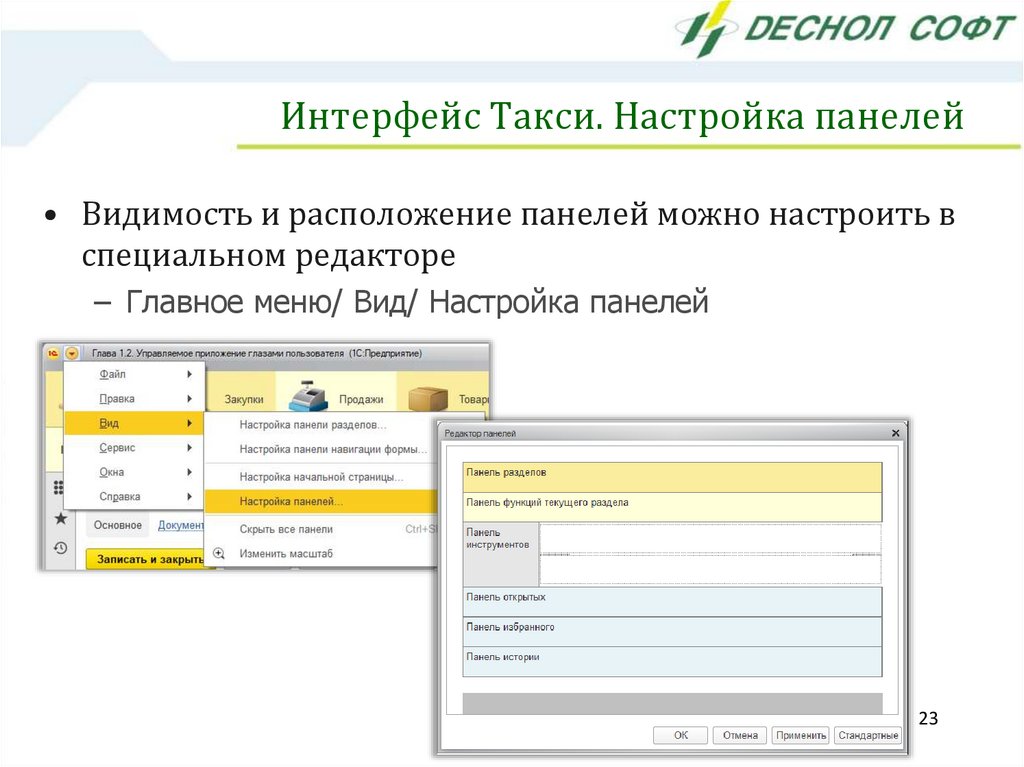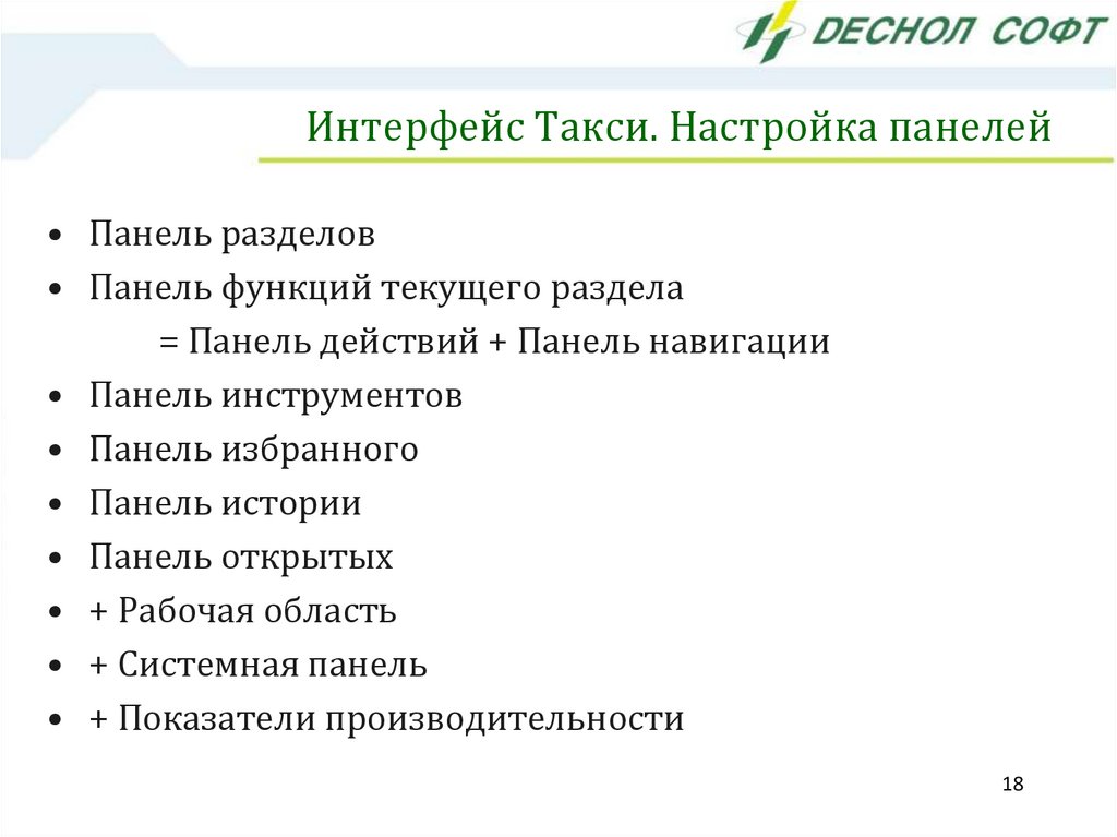 Интерфейс Такси. Настройка панелей• По дополнительному щелчку мыши на разделе