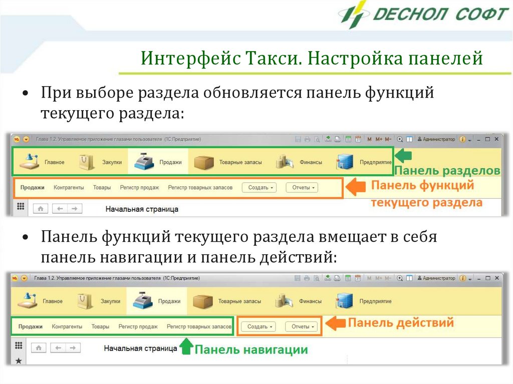 Интерфейс Такси. Настройка панелей• При выборе раздела обновляется панель функций