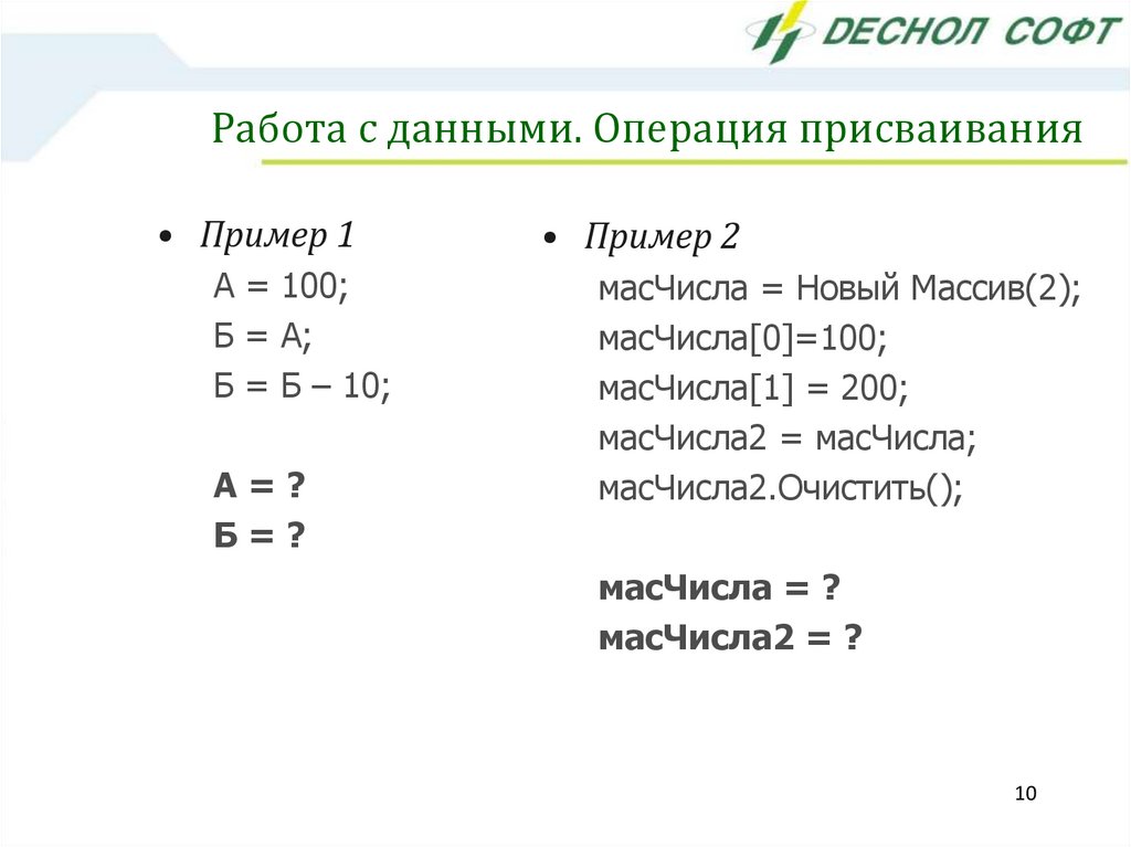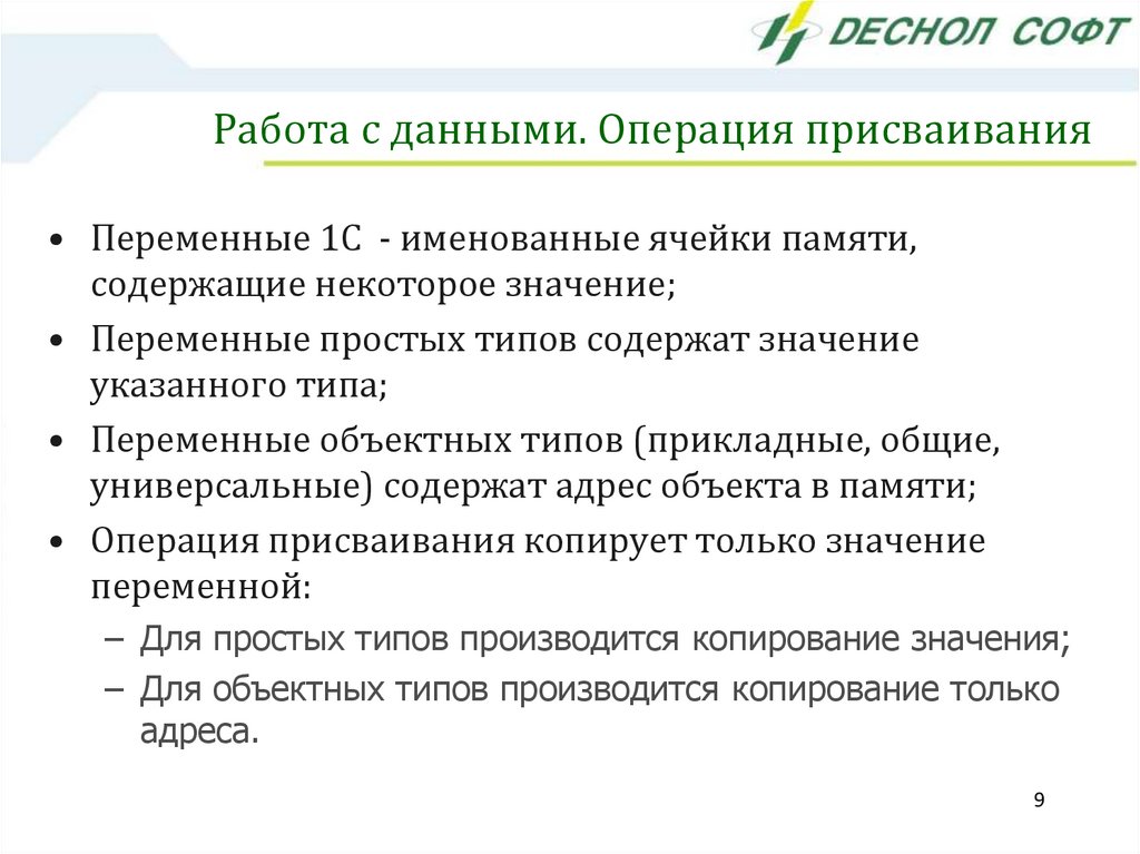 Работа с данными. Операция присваивания• Переменные 1С - именованные ячейки памяти,