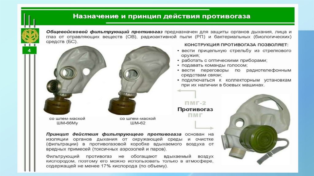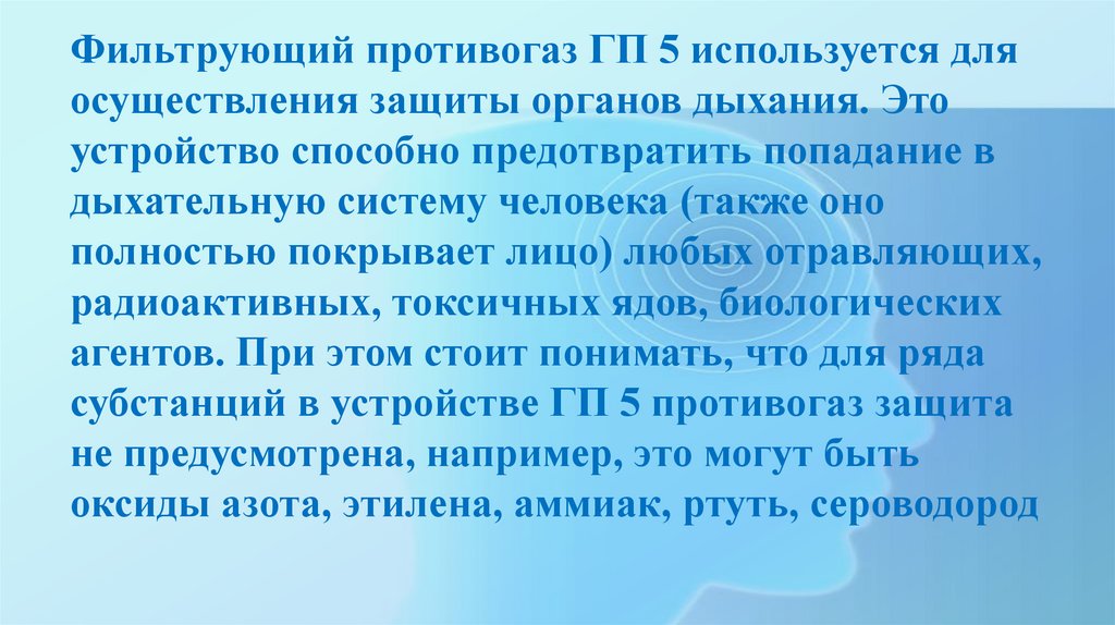 Фильтрующий противогаз ГП 5 используется дляосуществления защиты органов дыхания. Это