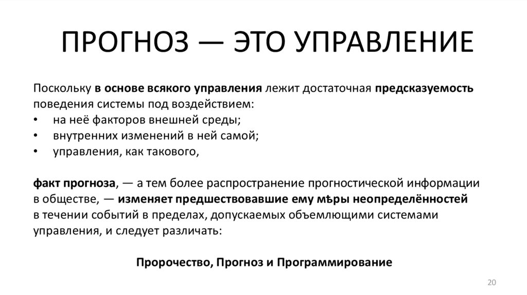 ПРОГНОЗ — ЭТО УПРАВЛЕНИЕПоскольку в основе всякого управления лежит достаточная предсказуемость