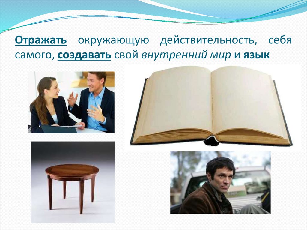 Отражать окружающую действительность, себясамого, создавать свой внутренний мир и язык