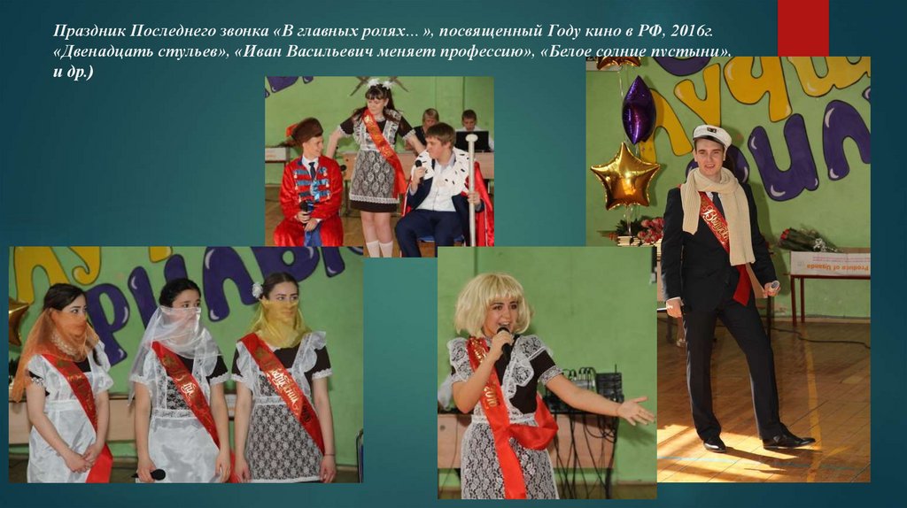 Праздник Последнего звонка «В главных ролях…», посвященный Году кино в РФ, 2016г.«Двенадцать стульев», «Иван Васильевич меняет профессию», «Белое солнце пустыни»,