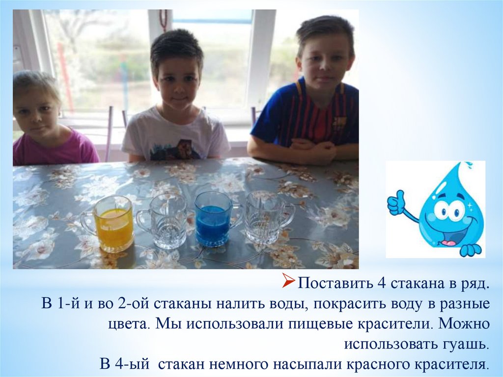 Поставить 4 стакана в ряд.В 1-й и во 2-ой стаканы налить воды, покрасить воду в разные