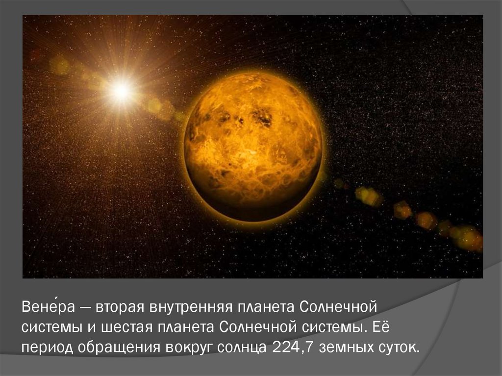 Вене́ра — вторая внутренняя планета Солнечнойсистемы и шестая планета Солнечной системы. Её