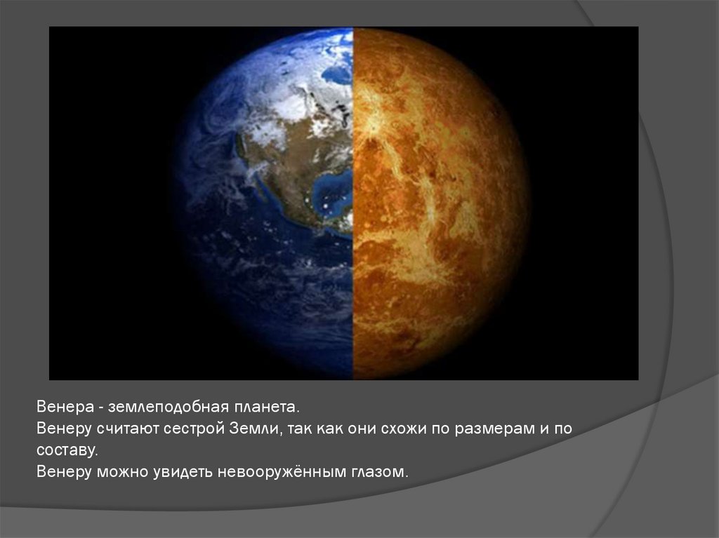 Венера - землеподобная планета.Венеру считают сестрой Земли, так как они схожи по размерам и по