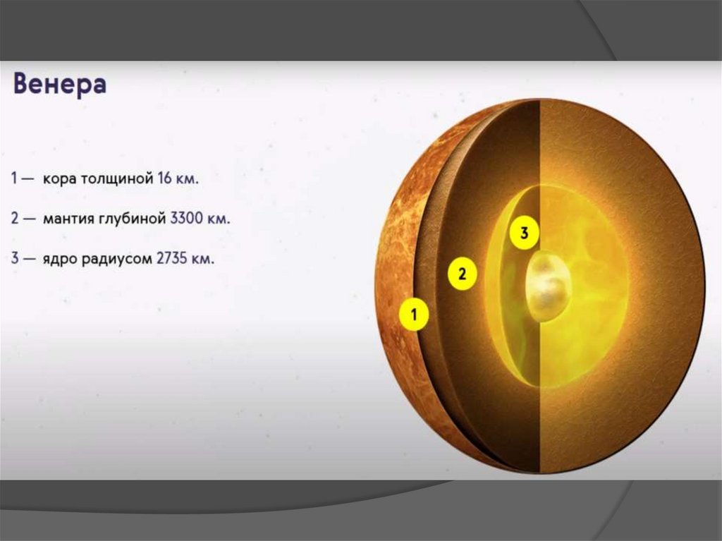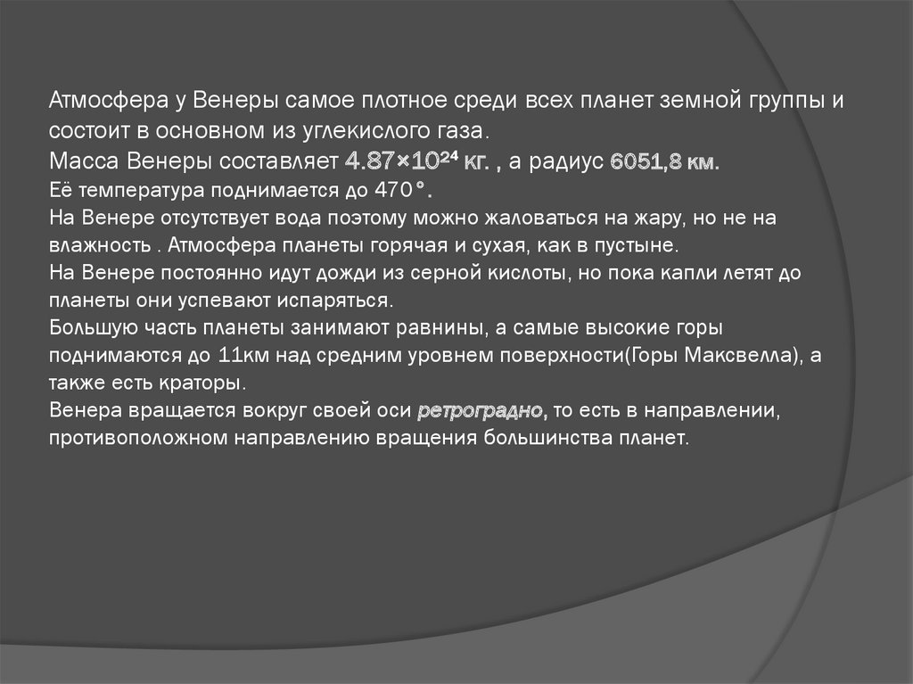 Атмосфера у Венеры самое плотное среди всех планет земной группы исостоит в основном из углекислого газа.