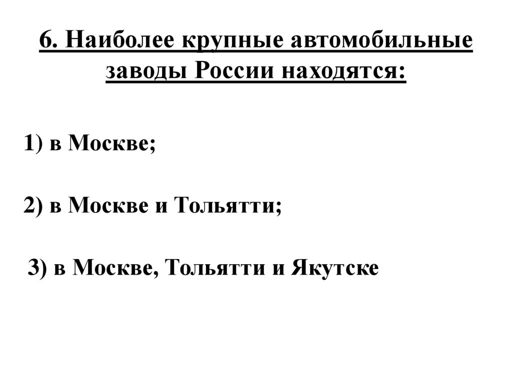 6. Наиболее крупные автомобильныезаводы России находятся: