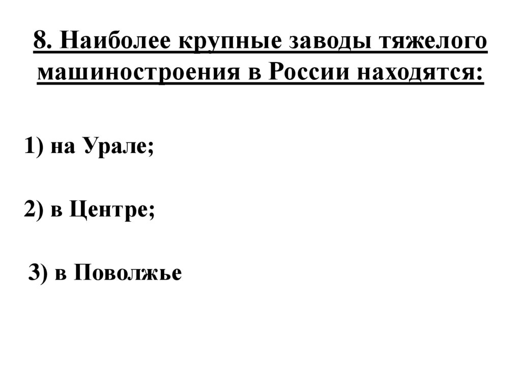 8. Наиболее крупные заводы тяжелогомашиностроения в России находятся:
