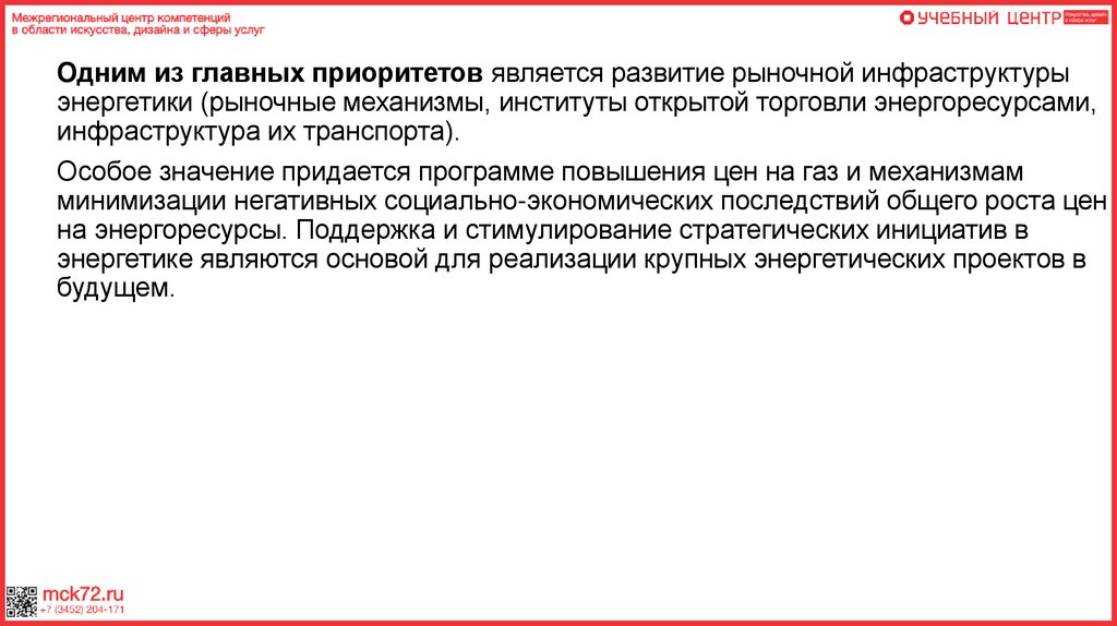 Одним из главных приоритетов является развитие рыночной инфраструктурыэнергетики (рыночные механизмы, институты открытой торговли энергоресурсами,