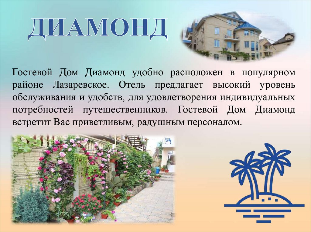 Гостевой Дом Диамонд удобно расположен в популярномрайоне Лазаревское. Отель предлагает высокий уровень