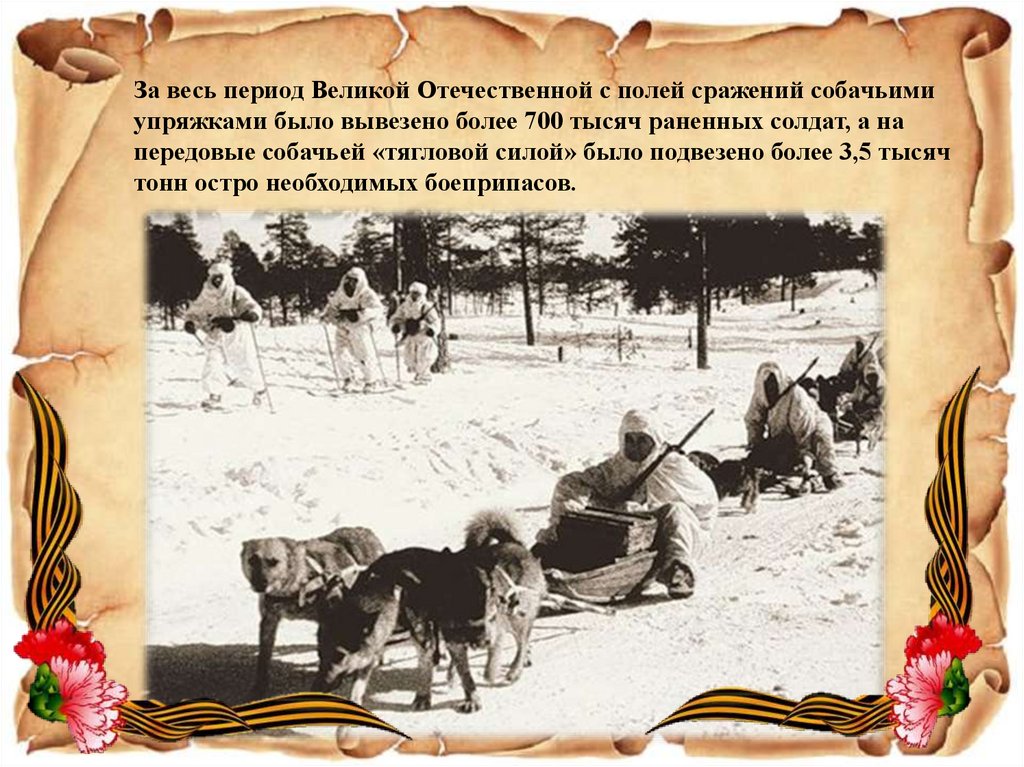 За весь период Великой Отечественной с полей сражений собачьимиупряжками было вывезено более 700 тысяч раненных солдат, а на