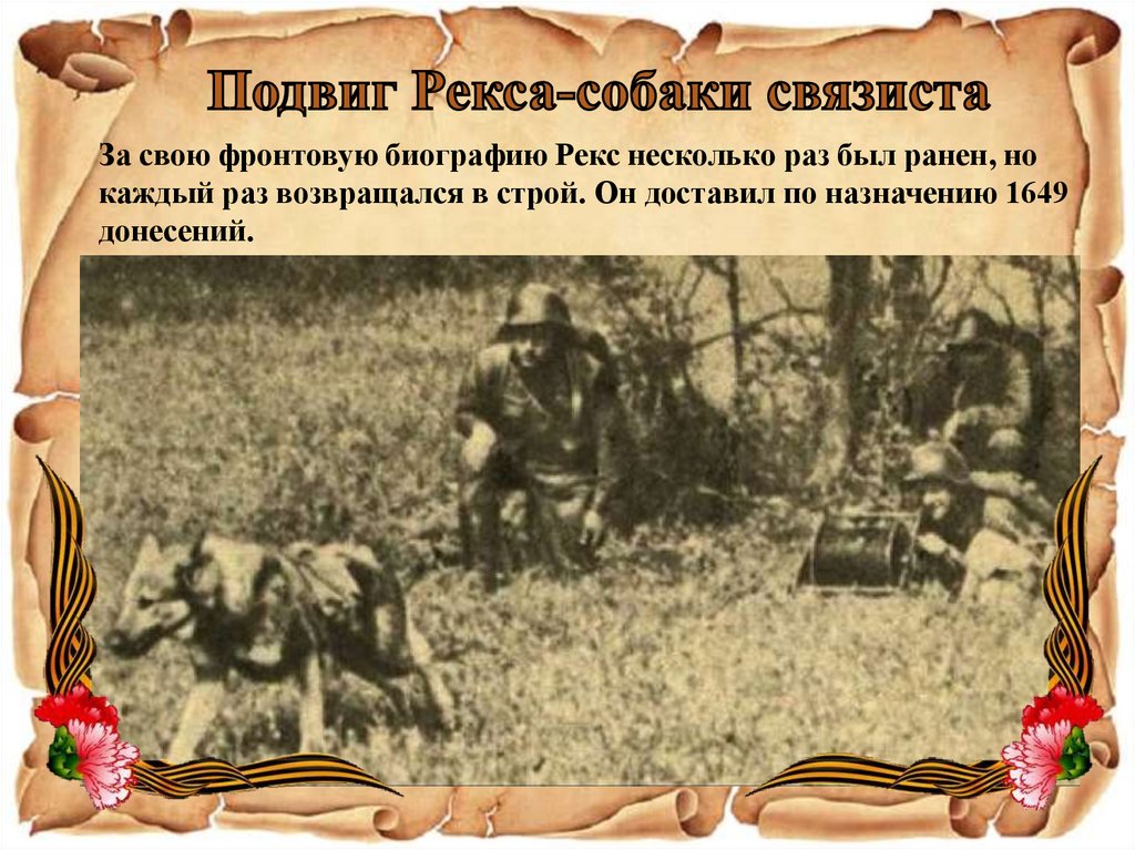 За свою фронтовую биографию Рекс несколько раз был ранен, нокаждый раз возвращался в строй. Он доставил по назначению 1649