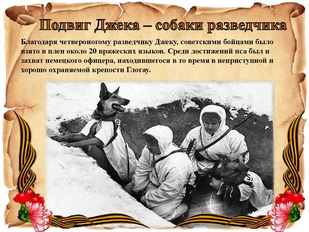 Благодаря четвероногому разведчику Джеку, советскими бойцами быловзято в плен около 20 вражеских языков. Среди достижений пса был и