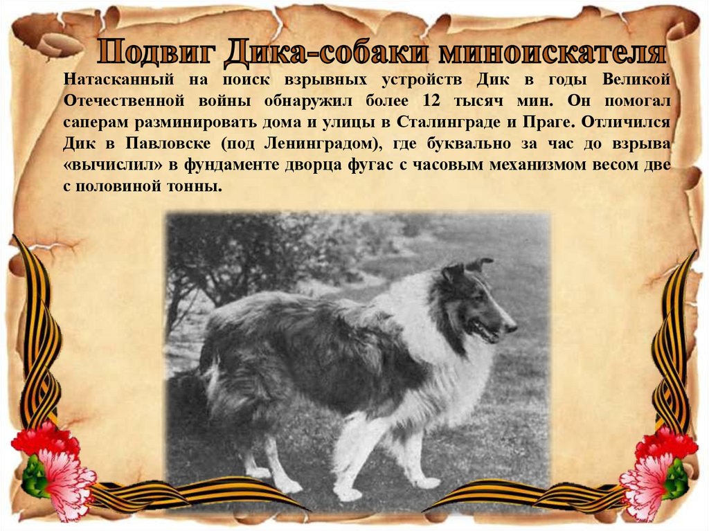 Натасканный на поиск взрывных устройств Дик в годы ВеликойОтечественной войны обнаружил более 12 тысяч мин. Он помогал