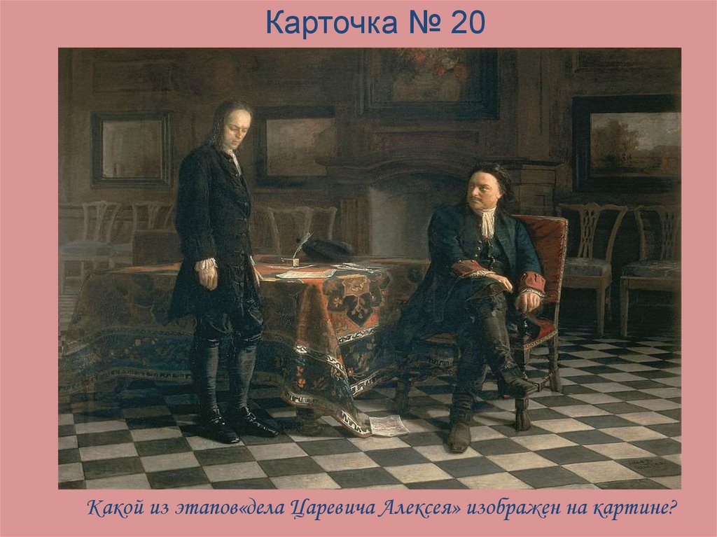 Карточка № 20Какой из этапов«дела Царевича Алексея» изображен на картине?