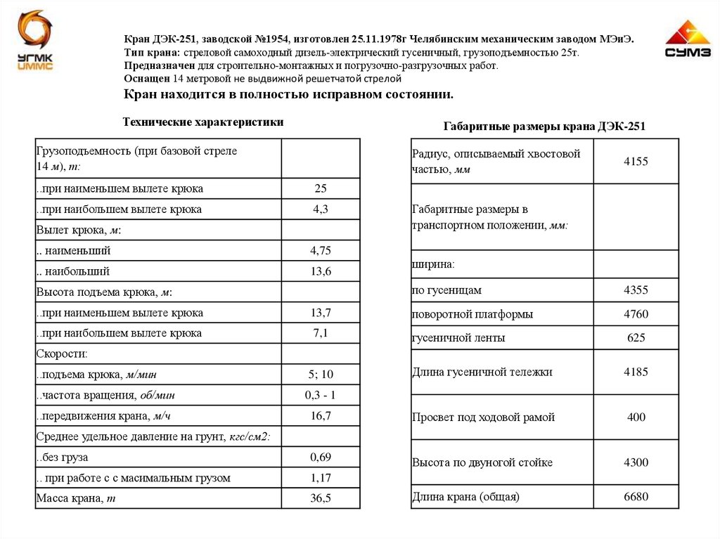 Кран ДЭК-251, заводской №1954, изготовлен 25.11.1978г Челябинским механическим заводом МЭиЭ.Тип крана: стреловой самоходный дизель-электрический гусеничный, грузоподъемностью 25т.