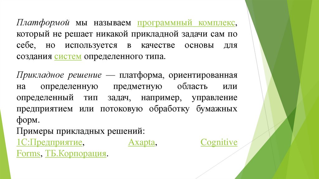 Платформой мы называем программный комплекс,который не решает никакой прикладной задачи сам по