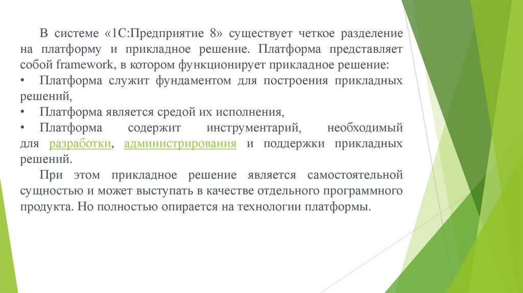 В системе «1С:Предприятие 8» существует четкое разделениена платформу и прикладное решение. Платформа представляет