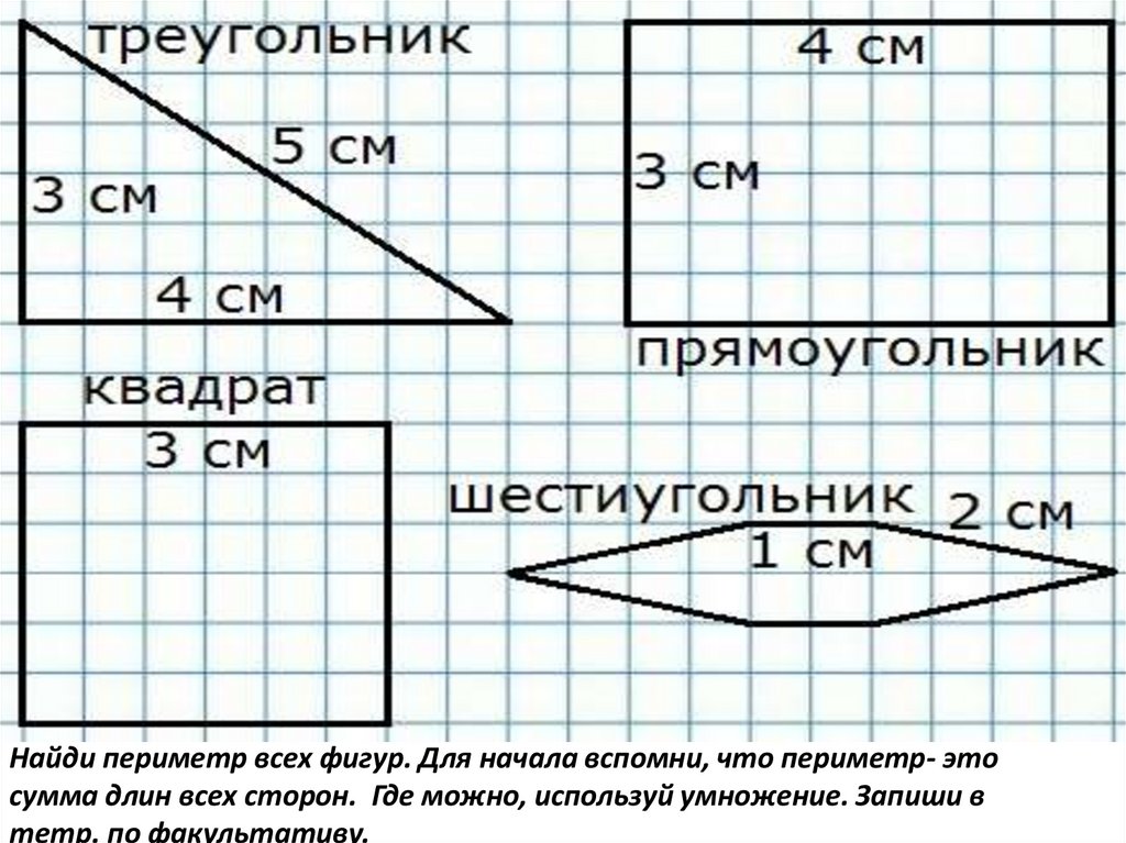 Найди периметр всех фигур. Для начала вспомни, что периметр- это