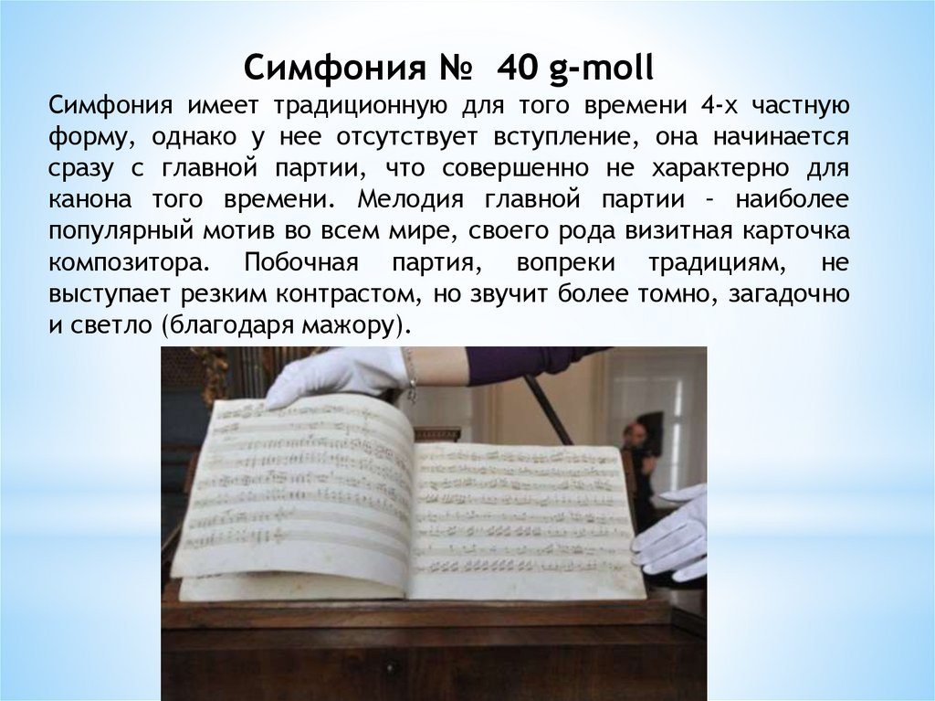 Симфония № 40 g-mollСимфония имеет традиционную для того времени 4-х частную