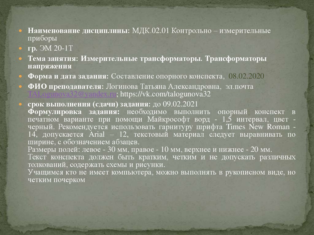 Форма и дата задания: Составление опорного конспекта, 08.02.2020