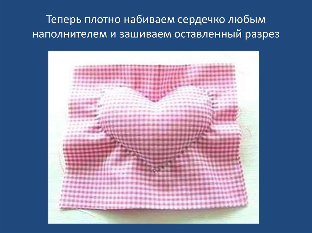 Теперь плотно набиваем сердечко любымнаполнителем и зашиваем оставленный разрез