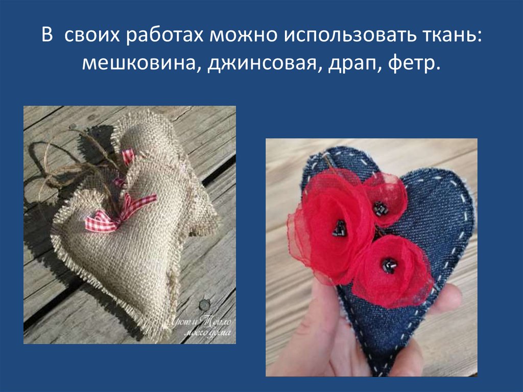 В своих работах можно использовать ткань:мешковина, джинсовая, драп, фетр.