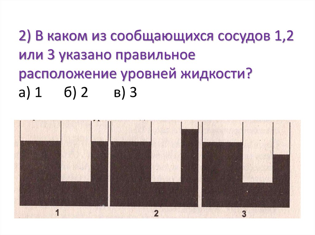 2) В каком из сообщающихся сосудов 1,2или 3 указано правильное
