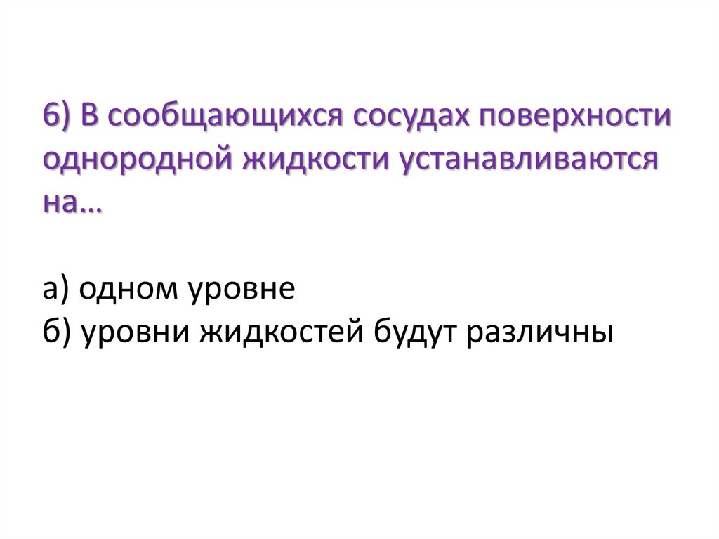 6) В сообщающихся сосудах поверхностиоднородной жидкости устанавливаются