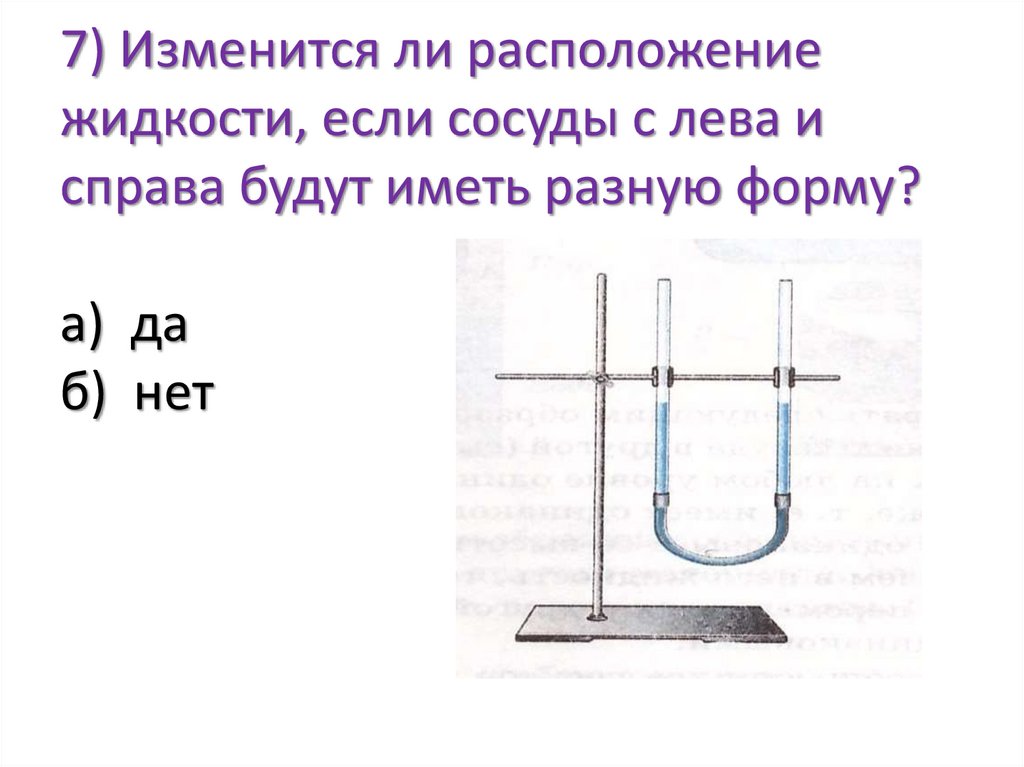 7) Изменится ли расположениежидкости, если сосуды с лева и