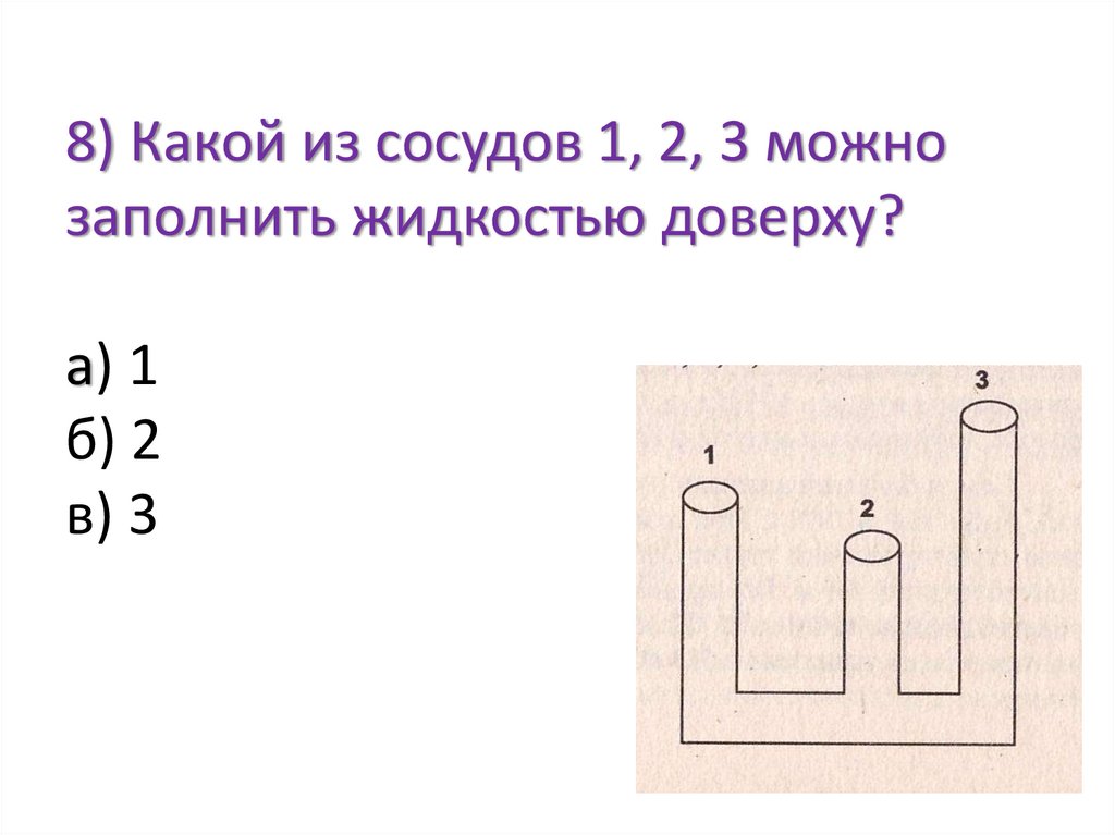 8) Какой из сосудов 1, 2, 3 можнозаполнить жидкостью доверху?