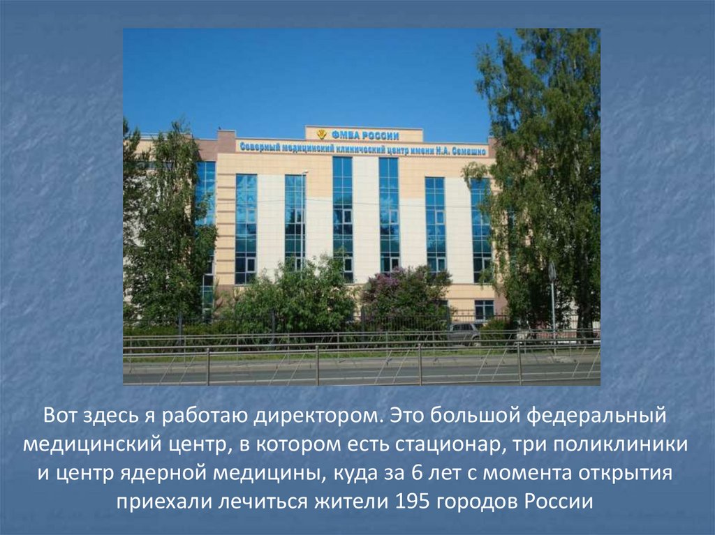 Вот здесь я работаю директором. Это большой федеральныймедицинский центр, в котором есть стационар, три поликлиники