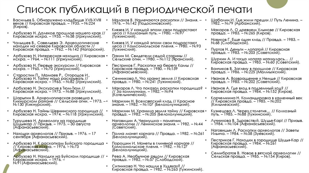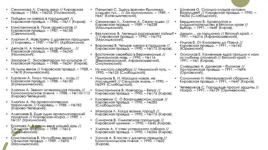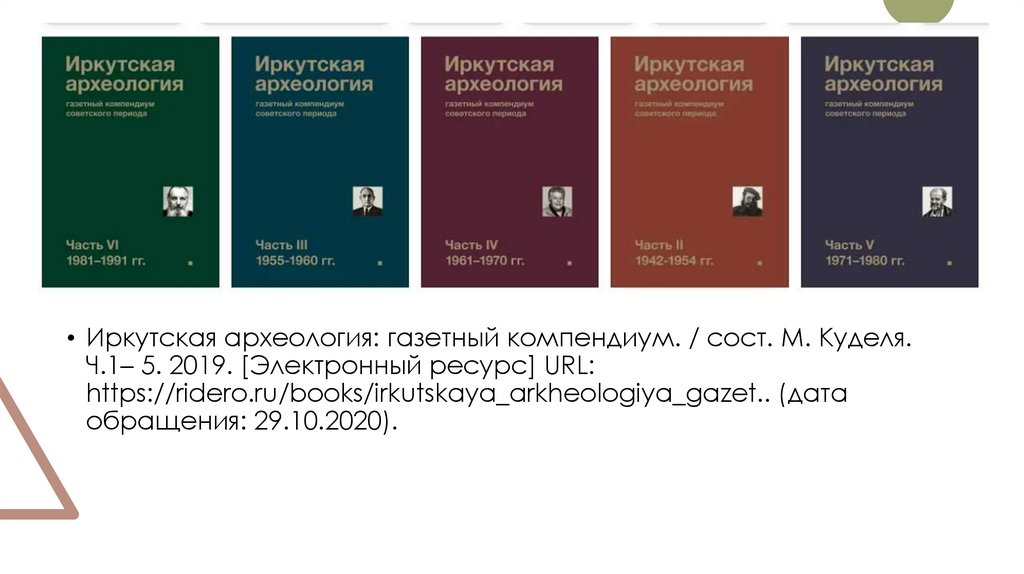 • Иркутская археология: газетный компендиум. / сост. М. Куделя.Ч.1– 5. 2019. [Электронный ресурс] URL: