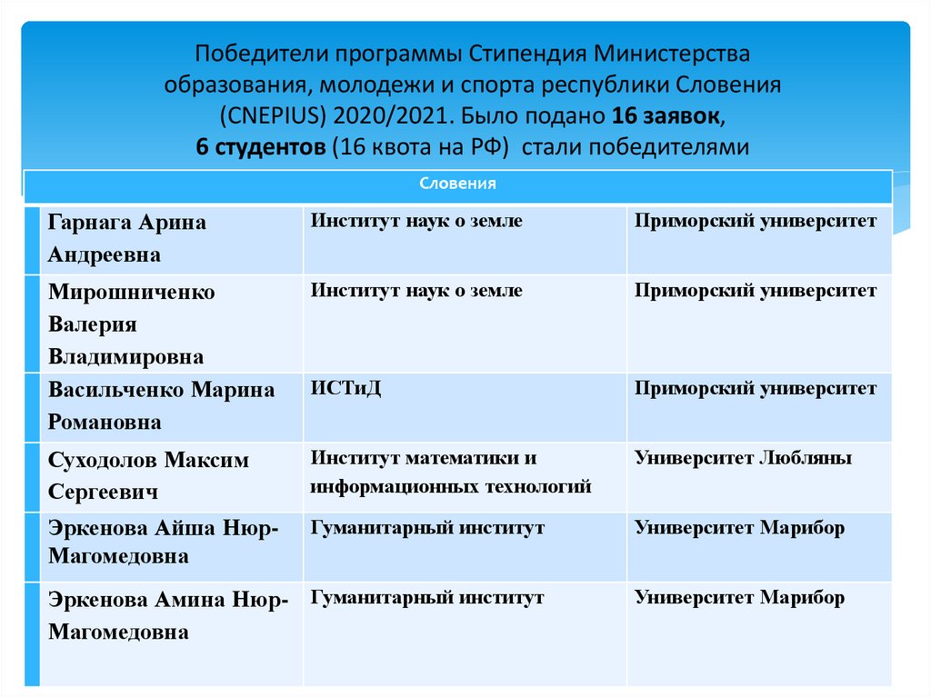 Победители программы Стипендия Министерстваобразования, молодежи и спорта республики Словения