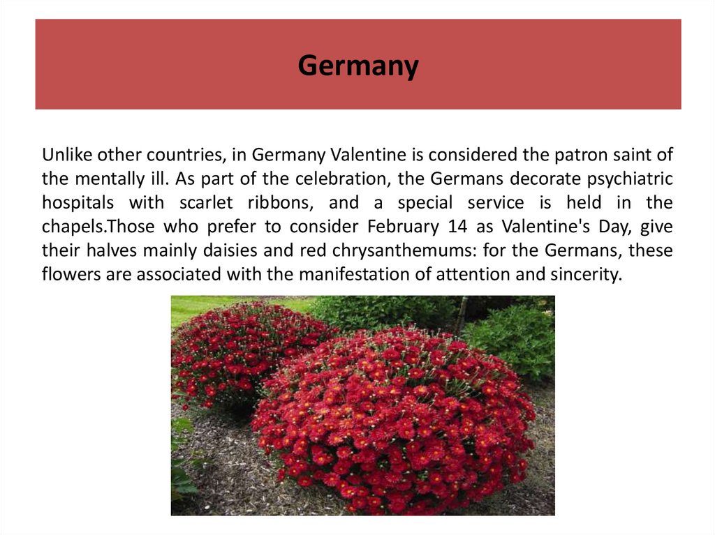 GermanyUnlike other countries, in Germany Valentine is considered the patron saint of