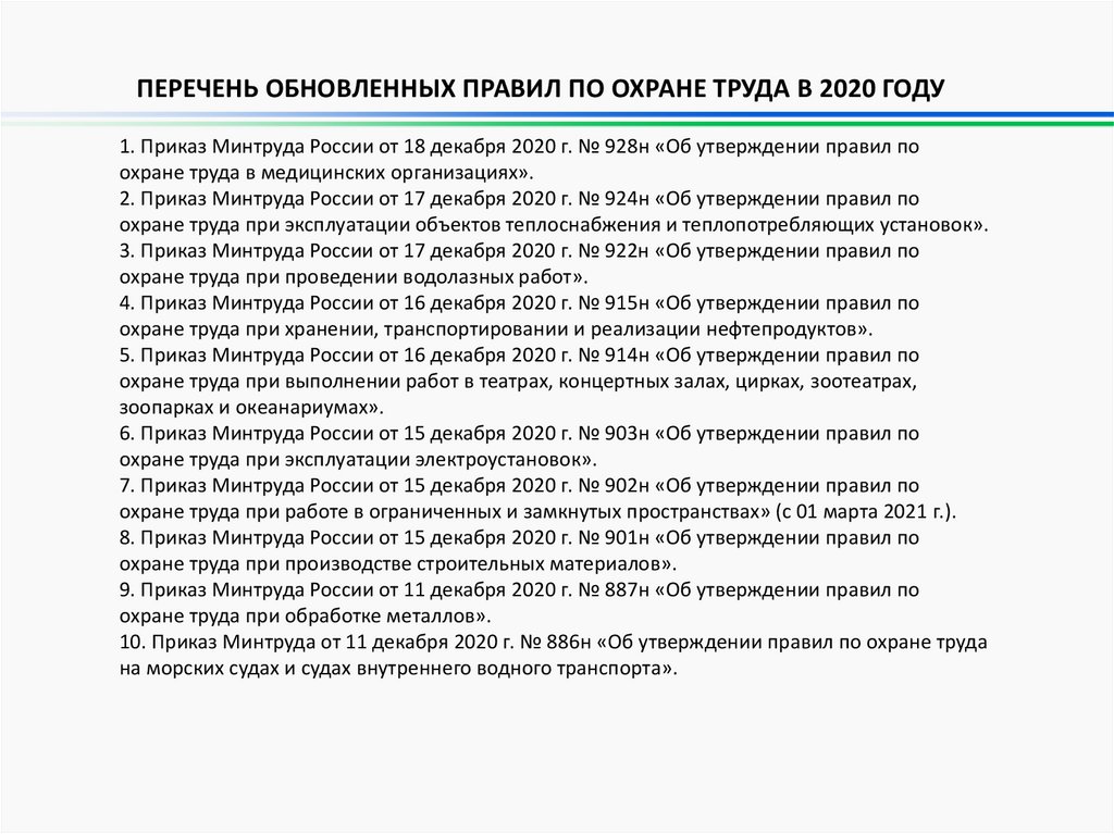 ПЕРЕЧЕНЬ ОБНОВЛЕННЫХ ПРАВИЛ ПО ОХРАНЕ ТРУДА В 2020 ГОДУ1. Приказ Минтруда России от 18 декабря 2020 г. № 928н «Об утверждении правил по