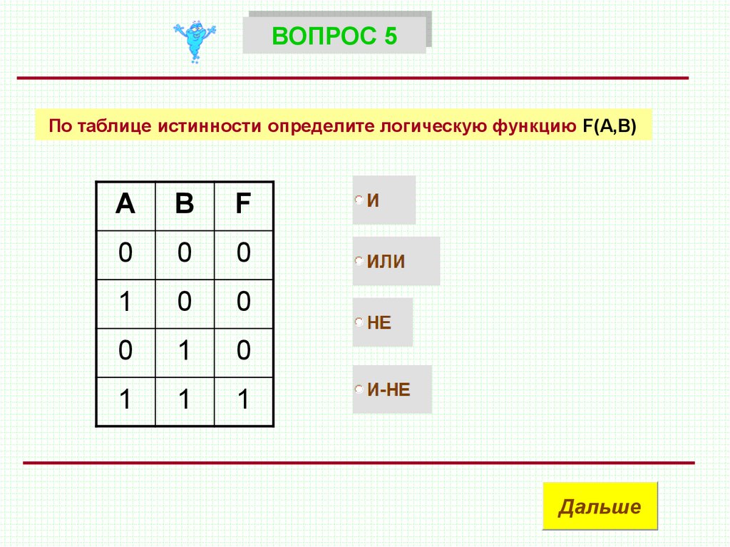 ВОПРОС 5По таблице истинности определите логическую функцию F(A,B)